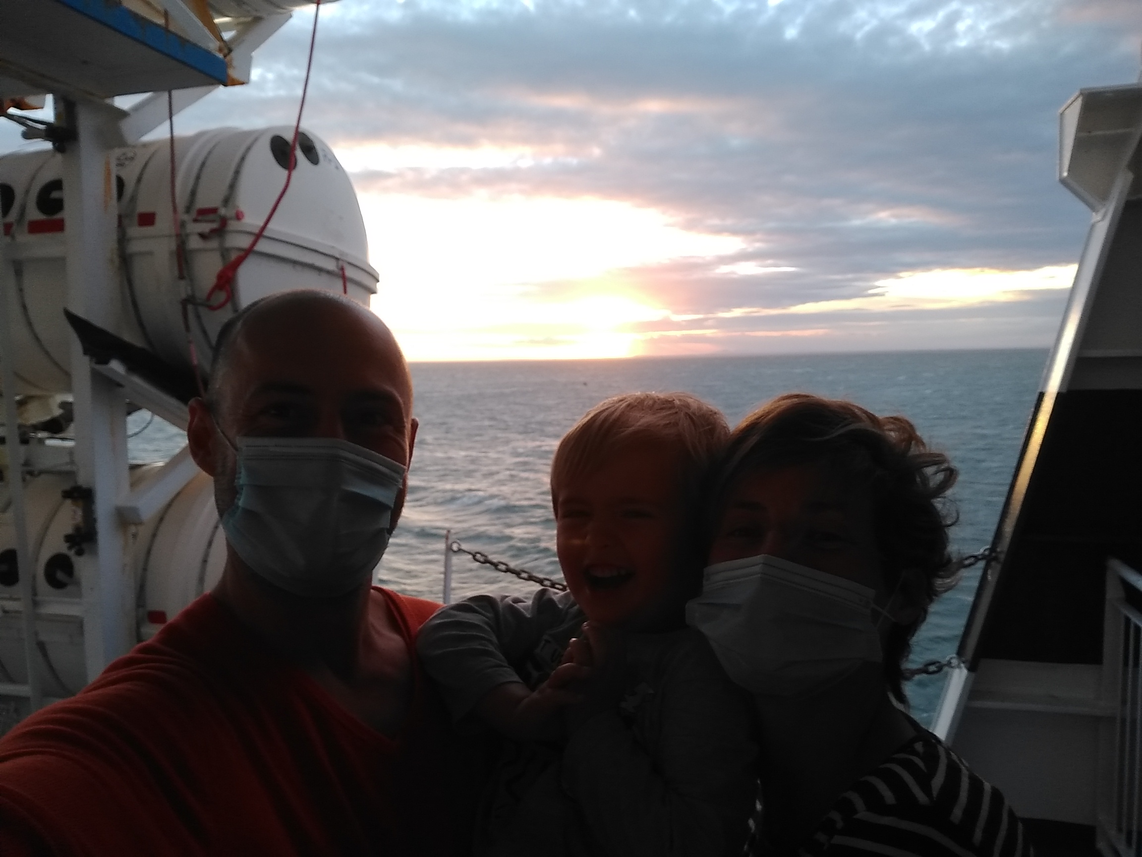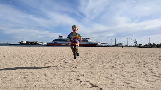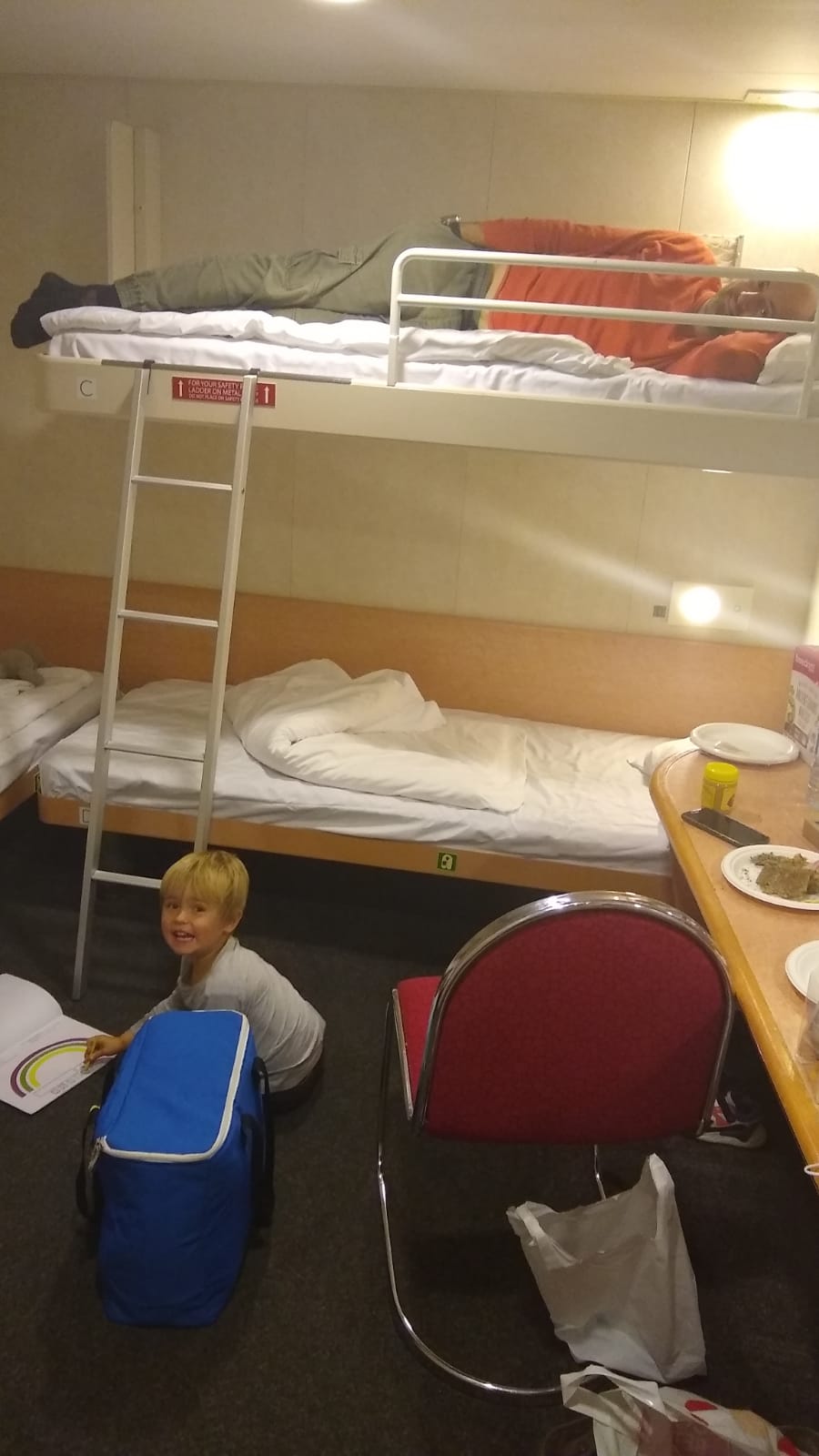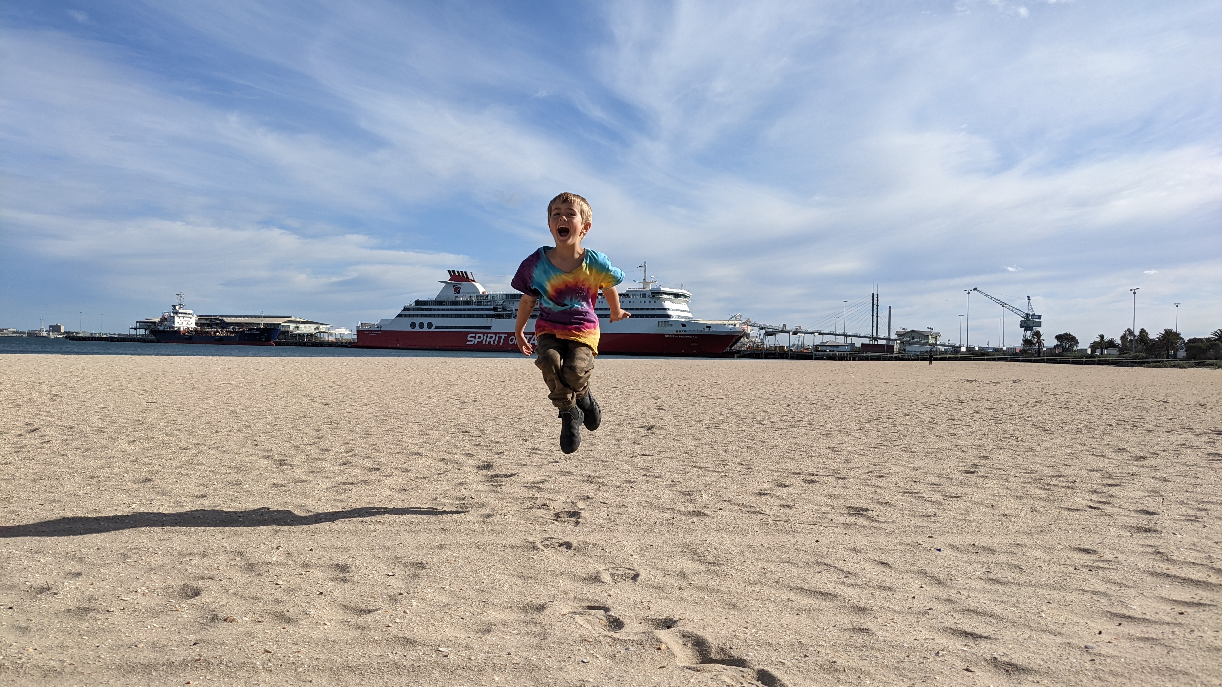 On the boat, we weren’t allowed to leave our windowless bunk room, other than fresh air breaks on the smokers’ deck, and Owen took a long time to fall asleep in all the excitement of Sleeping On A Boat. But waking at dawn and spotting the hills of Devonport lifted our hearts. This was it!