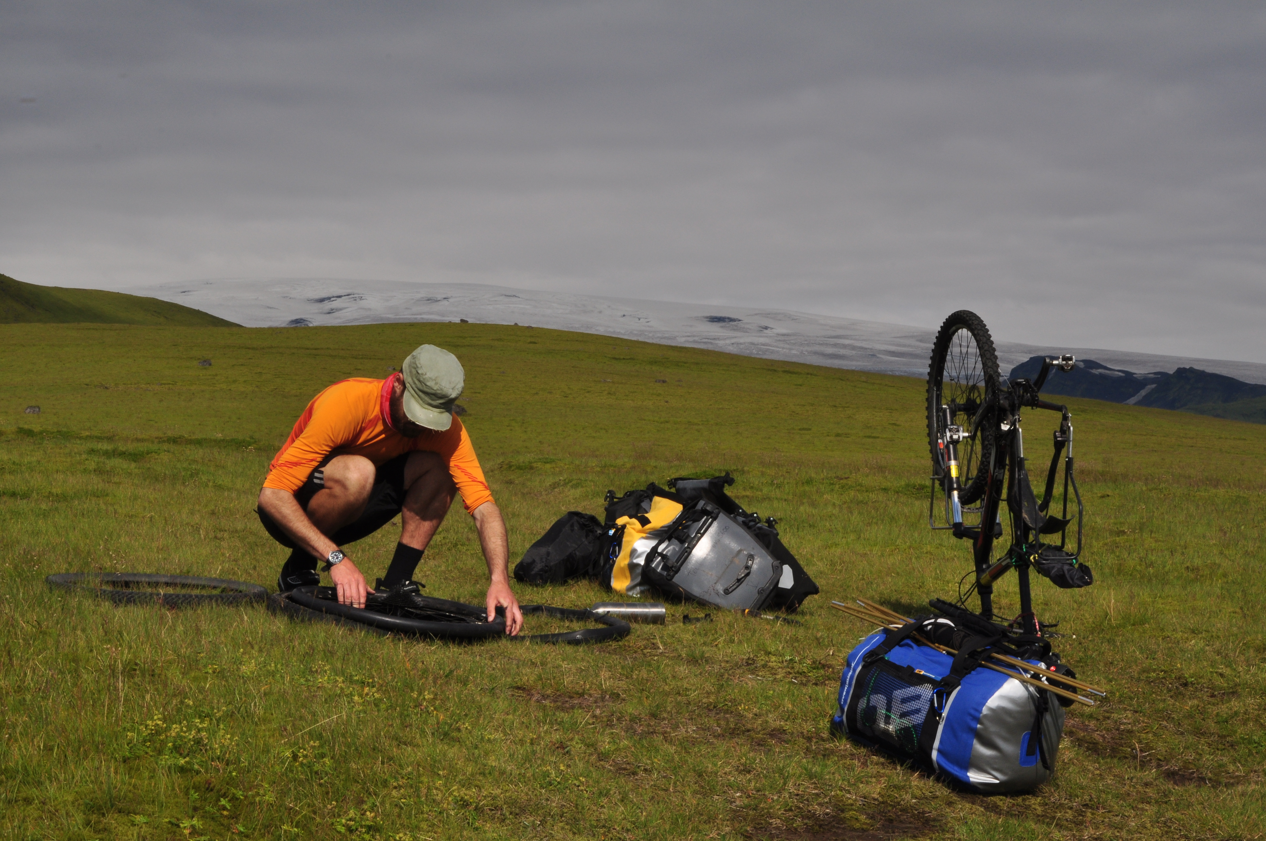 It looked mostly downhill for the rest of the way, and our only commitment was a bus to Reykjavik the following midday, so we rode on, Paul stopping every now and then to check on the Achilles’ heel in his tyre.