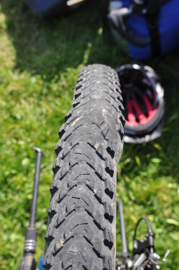 Paul and I both had similar responses to the sight: “Yuck, what is that?” Then he quickly let down the tyre pressure and I realised, of course – it was about to blow, just as Paul’s tyre had done less than 20 minutes earlier. Our bikes were like an elderly couple passing away in quick succession at the end of their long lives together. Of course, more likely it had something to do with the unusual heat in the day, tyre pressures set for riding on the sealed Ring Road, and simply old worn out gear.